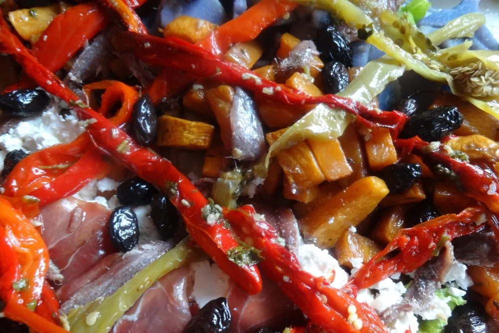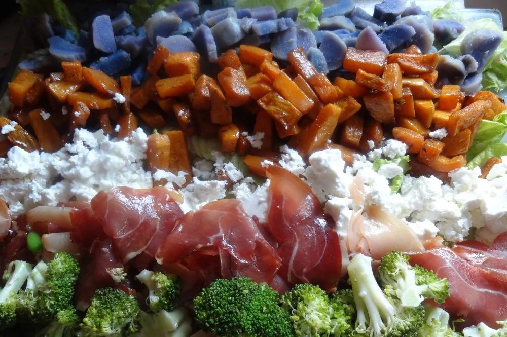 Ингредиенты для приготовления Слоеный овощной салат с прошутто и фетой на доске:
