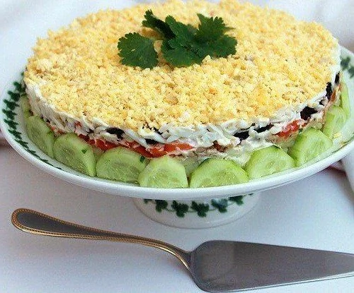 ШАГ 2 Выкладывать салат слоями, каждый слой промазываем майонезом: 1 слой — картофель, натертый на крупной терке; 2 слой — печень трески без масла, размять вилкой, майонезом не промазывать; 3 слой — лук мелко нарезать; 4 слой — морковь, натертая на крупной терке; 5 слой — чернослив, нарезанный соломкой; 6 слой — белок яйца, потертый на крупной терке; 7 слой: желтки мелко раскрошить.