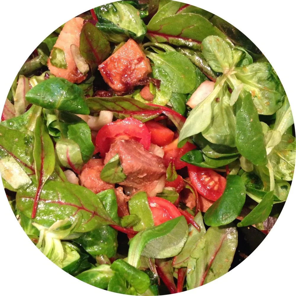 Тунец Салат корн Стебель сельдерея Помидоры черри Сладкий красный лук Мед Оливковое масло Соевый соус Сок лайма Мангольд Салаты Теплые салаты