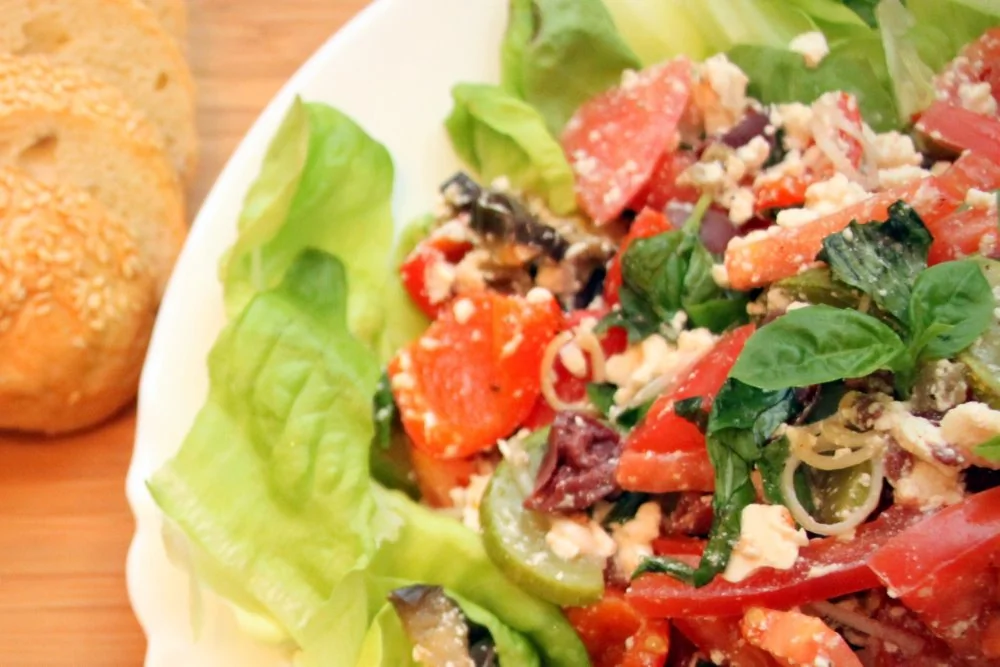 ШАГ 2 Салат романо порвать руками, помидоры нарезать тонкими дольками, лук-порей — кольцами, маслины можно добавить целиком или нарезать кружочками. Базилик порубить, но не очень мелко, оставить несколько листиков для украшения.