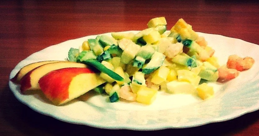 ШАГ 1 Очищенный авокадо, перец желтый, яйцо, яблоко нарезать мелкими кубиками, огурец — средними полосками, добавить кукурузу, отваренные креветки.
