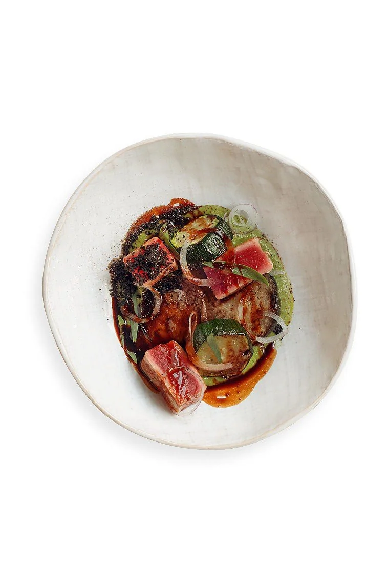 ШАГ 5 В тарелку выложить соус из брокколи (100 г), затем цукини, баклажан и тунца. Посыпать нарезанным кольцами луком и листиками эстрагона. Заправить соусом терияки. Посыпать землей из маслин.