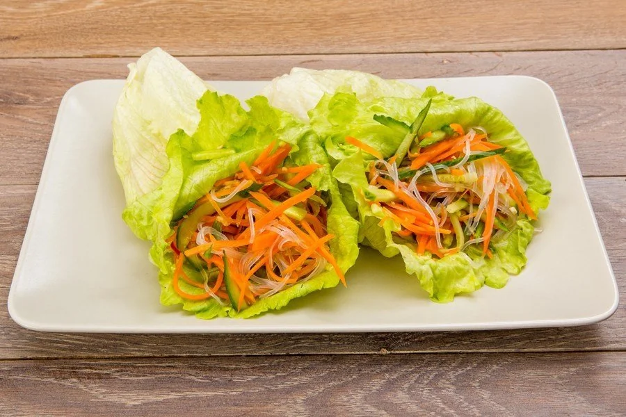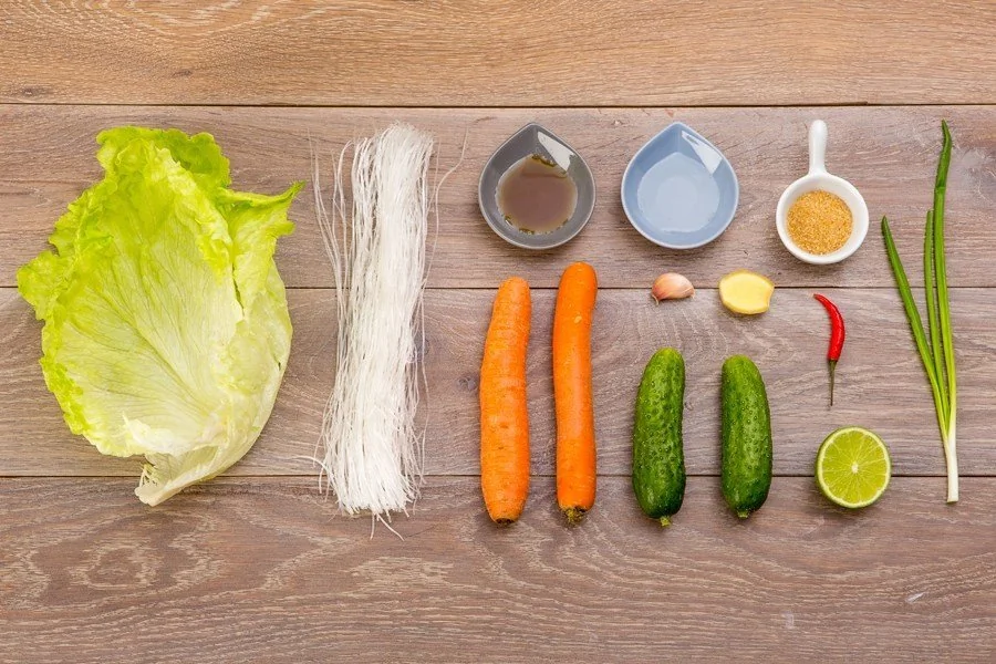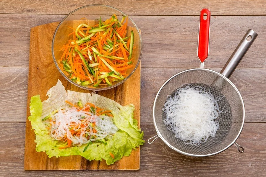 ШАГ 6 Смешайте морковь, огурцы, лук, выложите на каждый лист салата, добавьте лапшу.