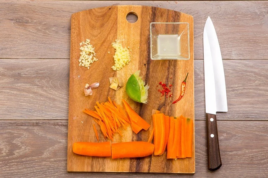 ШАГ 1 Очистите и нарежьте морковь тонкой длинной соломкой, раздавите, очистите и нарубите чеснок мелко, очистите и нарубите имбирь мелко, разрежьте перец чили вдоль, извлеките семена и нарубите 1/4 перца чили мелко; выжмите сок половины лайма.