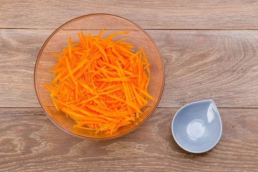 ШАГ 2 Разведите половину тростникового сахара в 150 мл воды, добавьте рисовый уксус, перемешайте и уложите в этот маринад морковь на 15 минут.