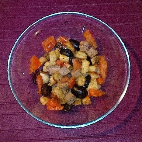 ШАГ 8 Нарезаем мясо, добавляем в него нарезанные помидоры, гренки и разрезанный на две половинки и очищенный от косточек виноград (количество винограда, помидоров и гренок может быть по вкусу).