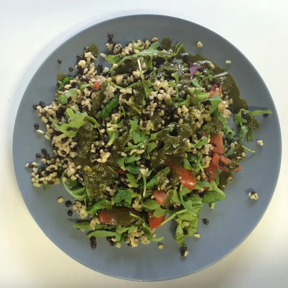 Зеленый салат с булгуром, чечевицей «белуга» и мятной заправкой