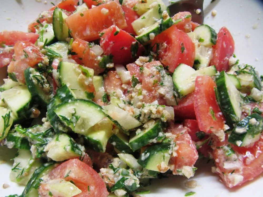 Ингредиенты для приготовления Салат из помидоров и огурцов с ореховым соусом: