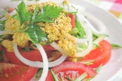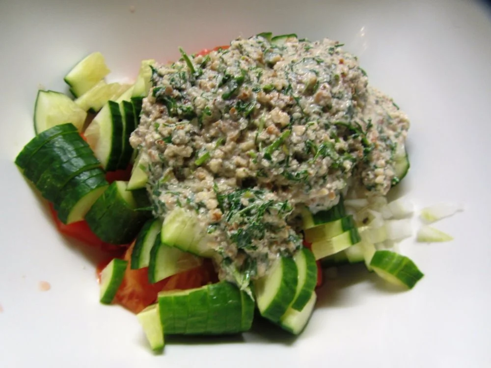 Выложите на блюдо огурцы с помидорами, сверху посыпьте луком, перцем и зеленью, сбрызните уксусом. Перед подачей полейте ореховым соусом.