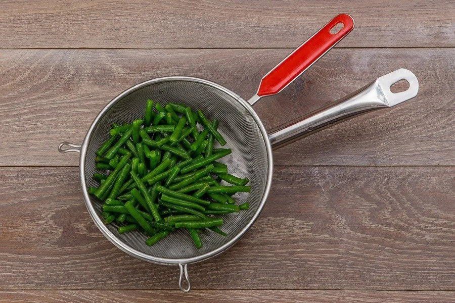 ШАГ 2 Фасоль разрежьте пополам, отварите на среднем огне 2 минуты, затем откиньте на дуршлаг и сполосните холодной водой.