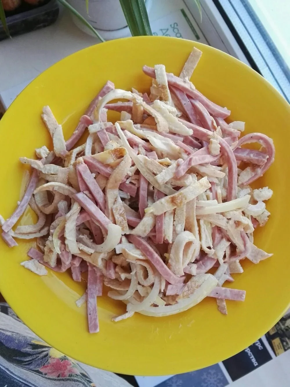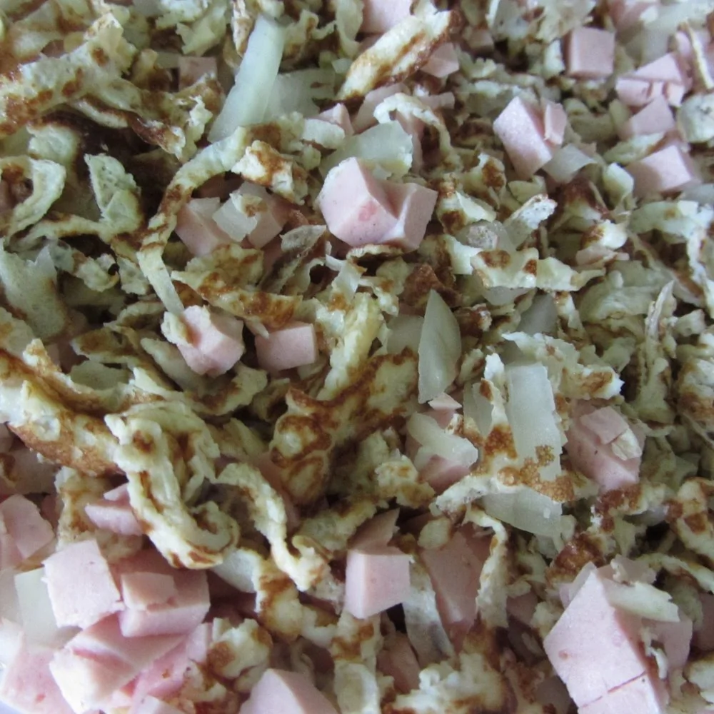 ШАГ 4 Яичные блинчики нарезать соломкой, добавить к ним колбасу, лук и заправить майонезом.