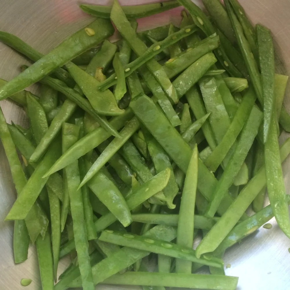 ШАГ 1 Возьмите зеленый горошек и нарежьте его вдоль на очень тонкие полоски (опционно можно бланшировать горошек в течение 1 минуты в кипятке, и после этого перенесите в холодную воду, желательно со льдом, для того, чтобы горошек не потерял цвет).