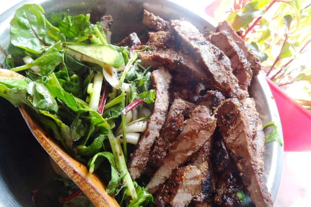 Рустикальный зеленый салат с говяжей печенью и трюфельным маслом