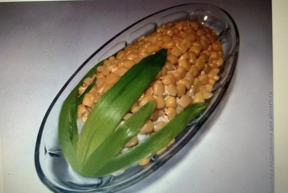 ШАГ 3 Выкладываем в форме початка. Оставшуюся кукурузой, если есть время, аккуратно распределяем по салату (можно и в хаотичном порядке придавить к салату, чтобы держались хорошо).