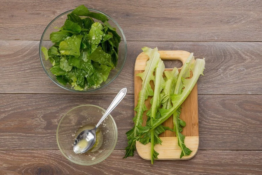 ШАГ 6 Романо крупно порвите и положите в салатницу, залейте заправкой, перемешайте.