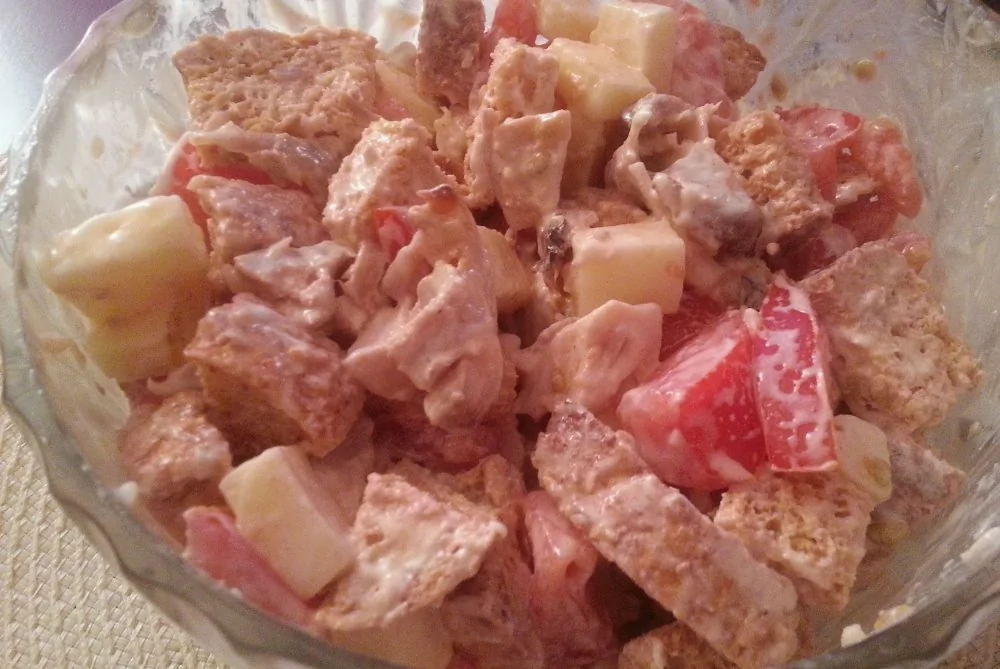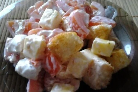 ШАГ 4 Поскольку помидоры быстро дают сок, сразу подаем на стол. Перед подачей добавить сухарики и еще раз перемешать.