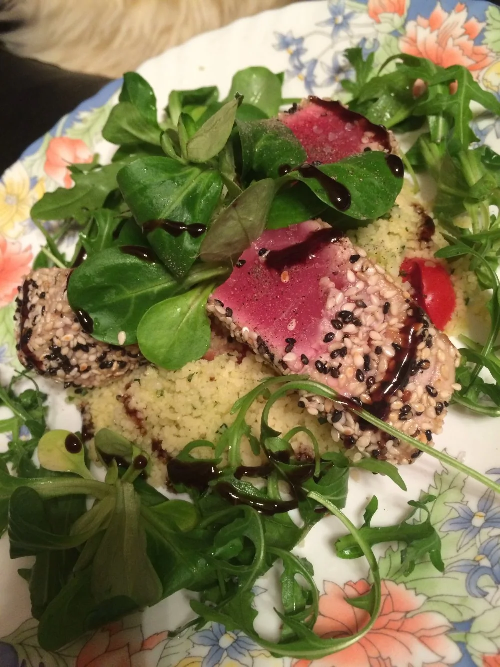 ШАГ 5 Выкладываем кускус в тарелки, кладем сверху тунца, украшаем корном. Срез тунца обязательно приправляем свежемолотым черным перцем и солью.
