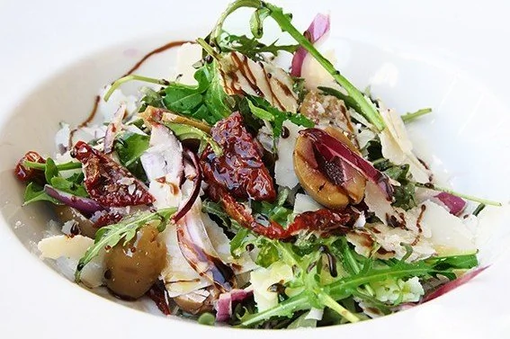 ШАГ 6 Перемешать все с рукколой и оливками и заправить.