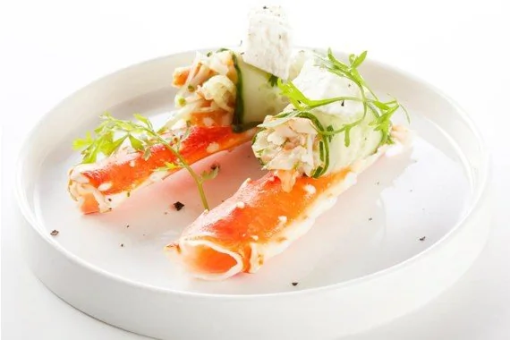ШАГ 3 На лепестки огурца разложите понемногу крабового салата и сверните роллами. Сверху выложите кусочек рикотты Unagrande, украсьте кресс-салатом и подавайте на стол.