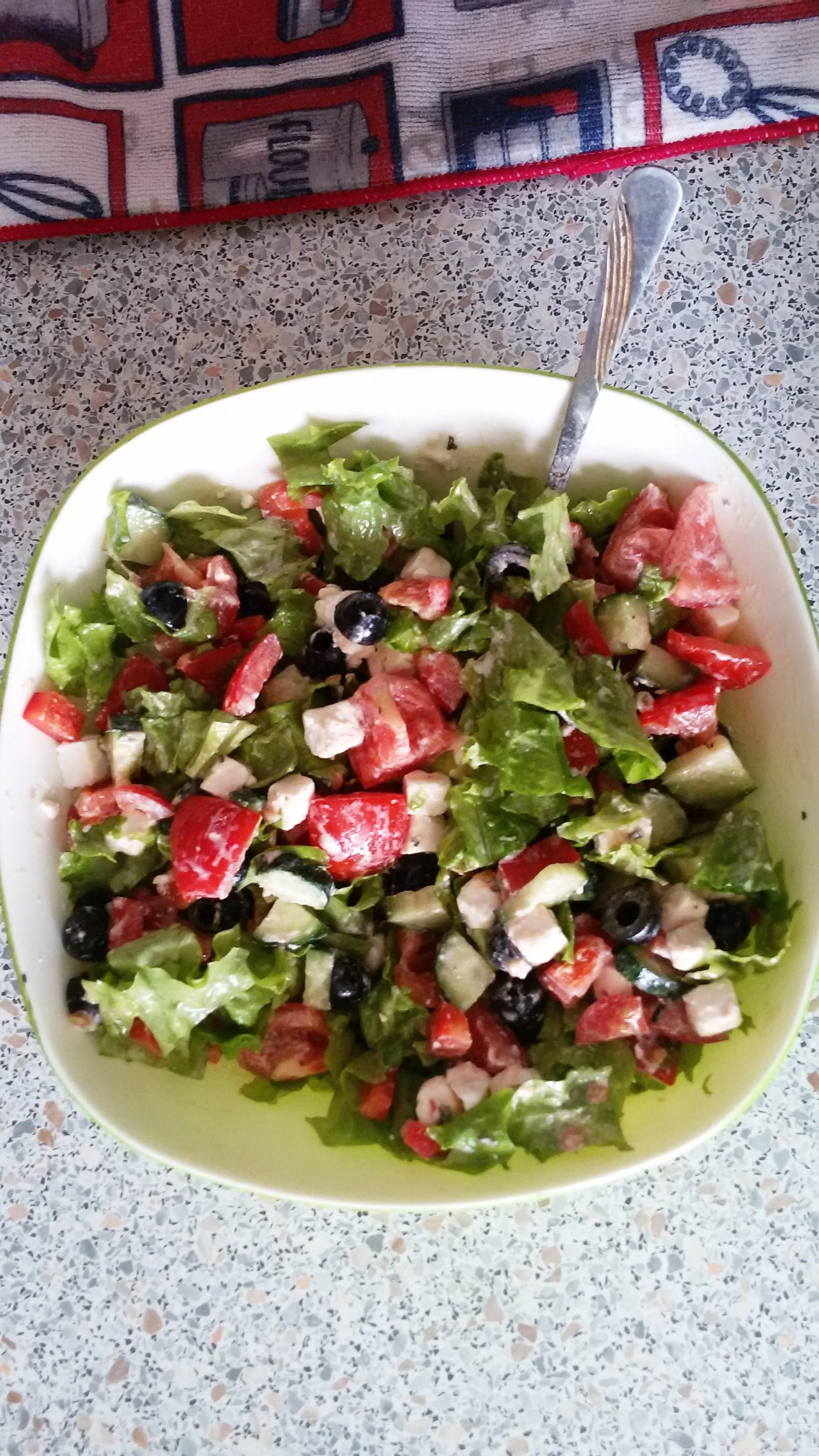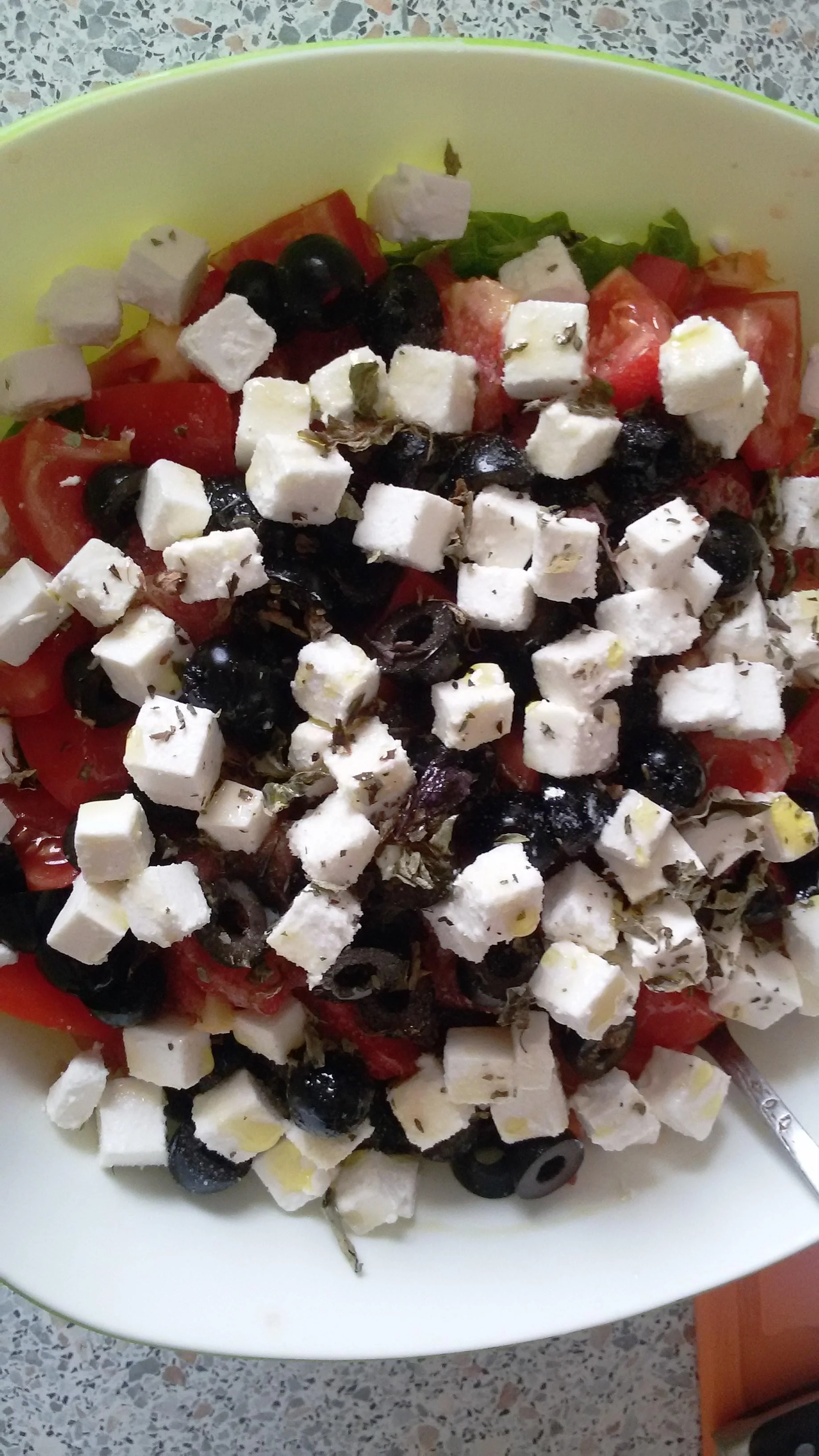 ШАГ 1 Тонко нарезать красный лук, помидоры «сливки» или «дамские пальчики», огурец, греческие оливки «каламата», все смешать.