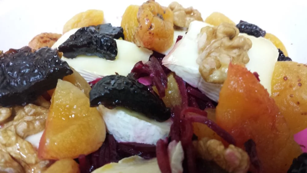 ШАГ 2 Выложить сначала в салатник резаную свеклу (я брала уже готовую и резаную 'белая дача'), сверху крупными кусками порезать сыр, курагу и чернослив, положить орехи. Затем полить сверху медом. Подождать как минимум полчаса, чтобы свекла дала сок под весом остальных продуктов и затем слегка перемешать.