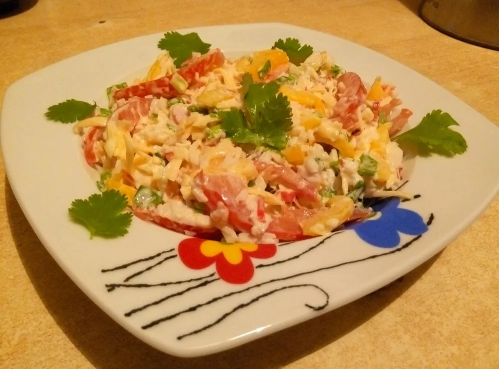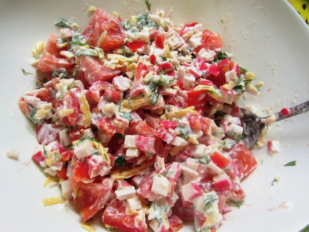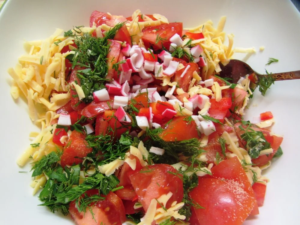 Ингредиенты для приготовления Крабовый салат с помидорами и сладким перцем: