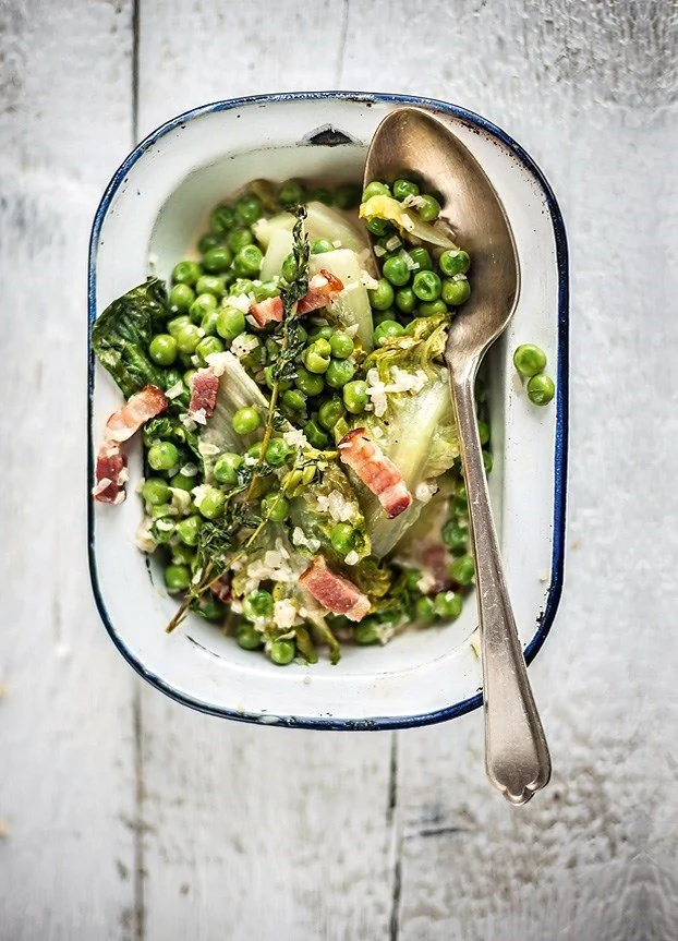 Тушеный салат романо с копченым беконом и зеленым горошком