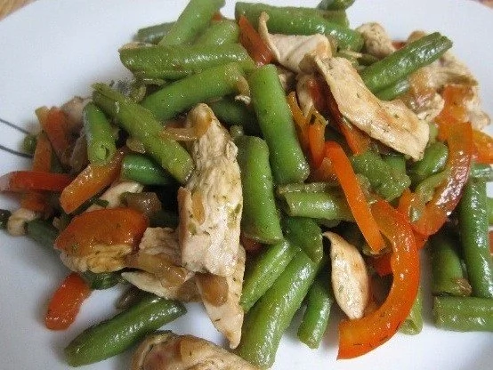 Теплый салат с курицей, перцем и стручковой фасолью