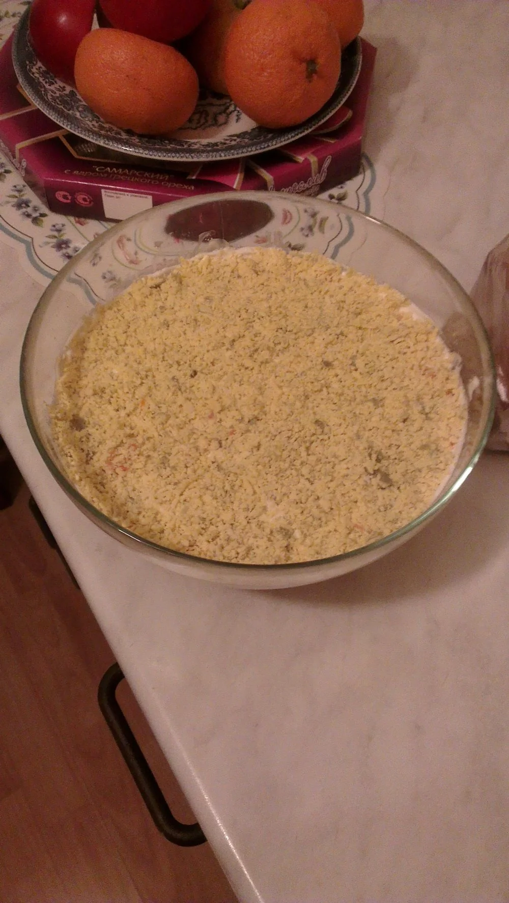 ШАГ 7 На мелкой терке натереть желтки, выложить в салатницу на морковь (без майонеза).