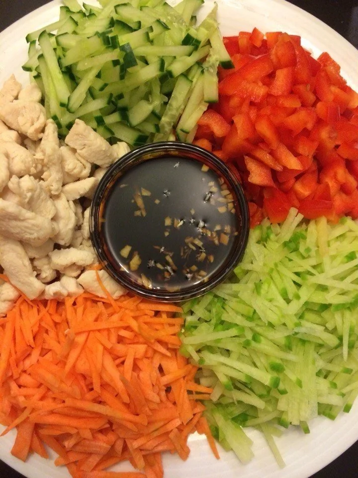 Овощной салат с куриным филе и заправкой из соевого соуса