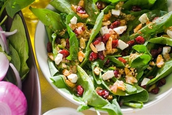 Зеленый салат с козьим сыром, сушеной клюквой и арахисом