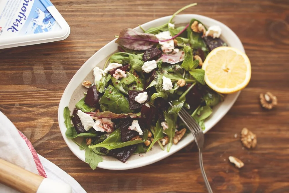 ШАГ 4 Выложите в тарелки салатный микс, распределите по тарелке козий сыр, дольки маринованной свеклы и грецкий орех. Заправьте салат оставшимся маринадом.