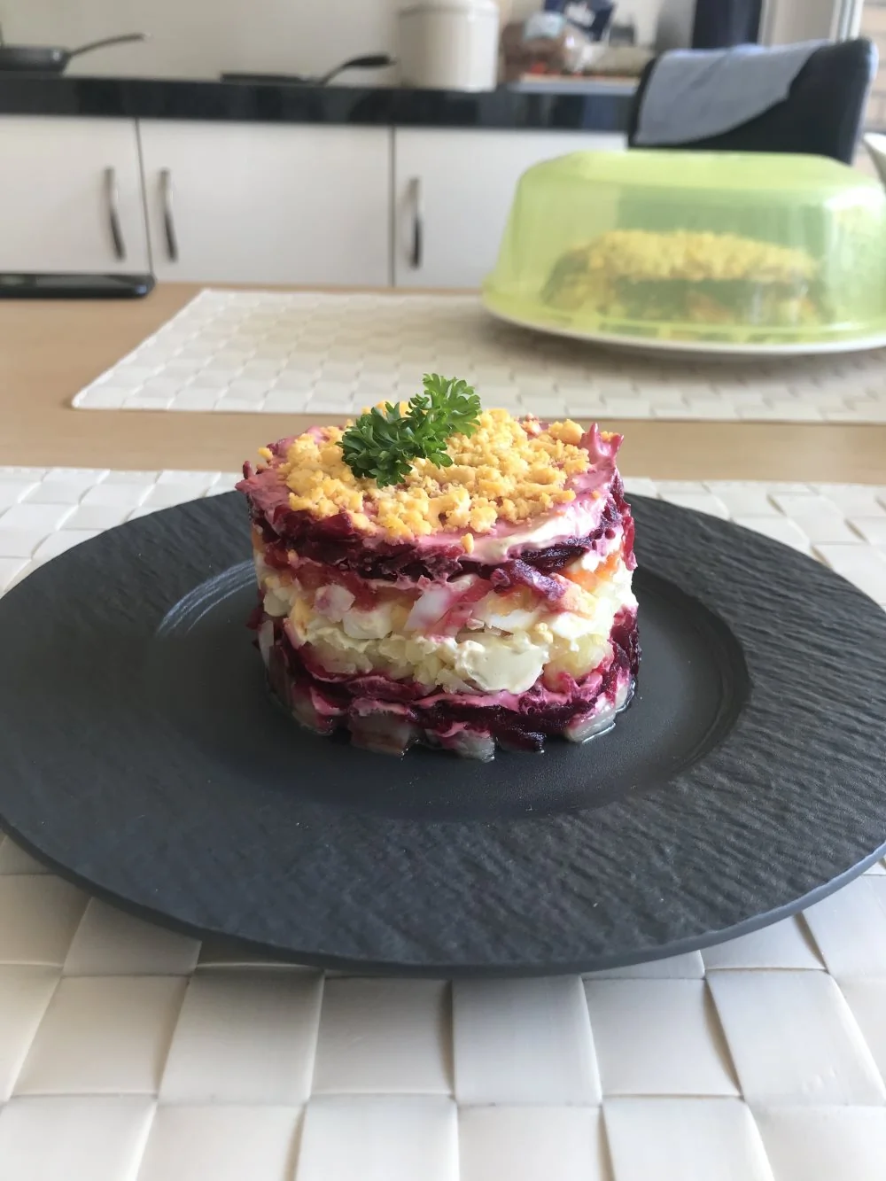 ШАГ 5 Выкладываем на порционную тарелку сначала сельдь, потом лук, картофель, яйцо, морковь, свеклу.