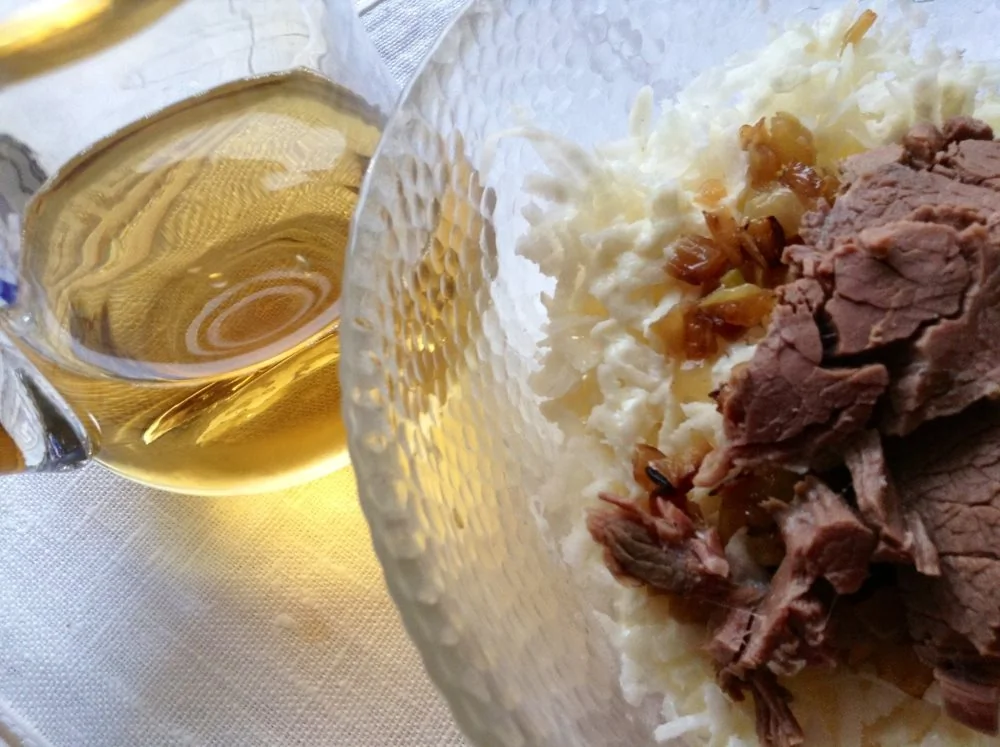 Салат из редьки с говядиной и карамелизованным луком