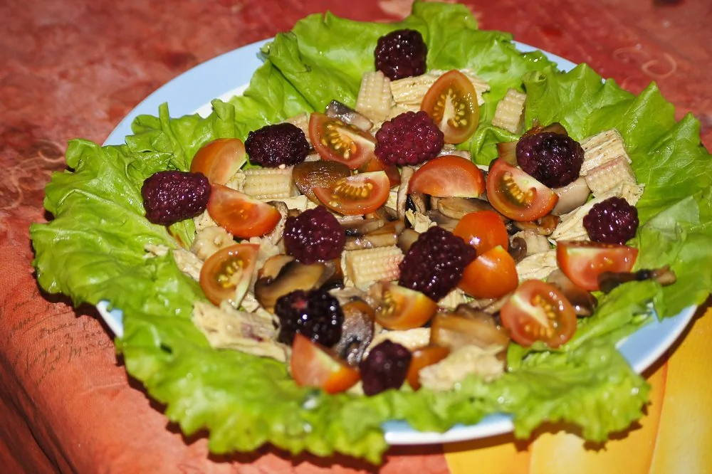 ШАГ 6 Выложить все подготовленные ингредиенты на промытые и высушенные листья салата. Сверху украсить ягодами малины. Заправить соусом и подавать к столу.
