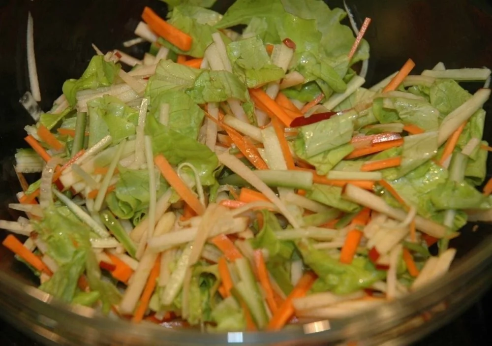 ШАГ 1 Нарезать тонкими ломтиками яблоко, морковь и огурец.