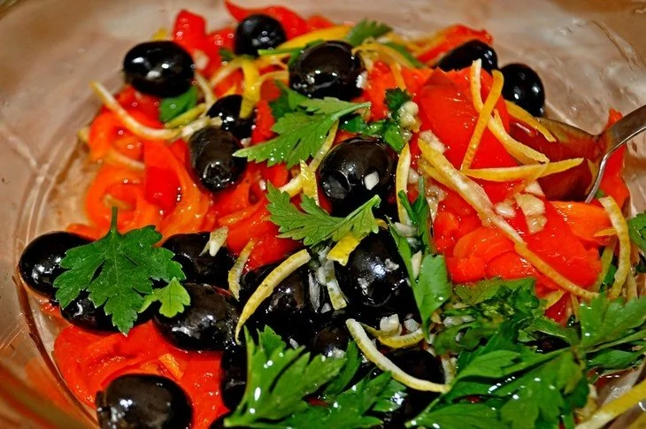 Ингредиенты для приготовления Салат с печеным сладким перцем и оливками: