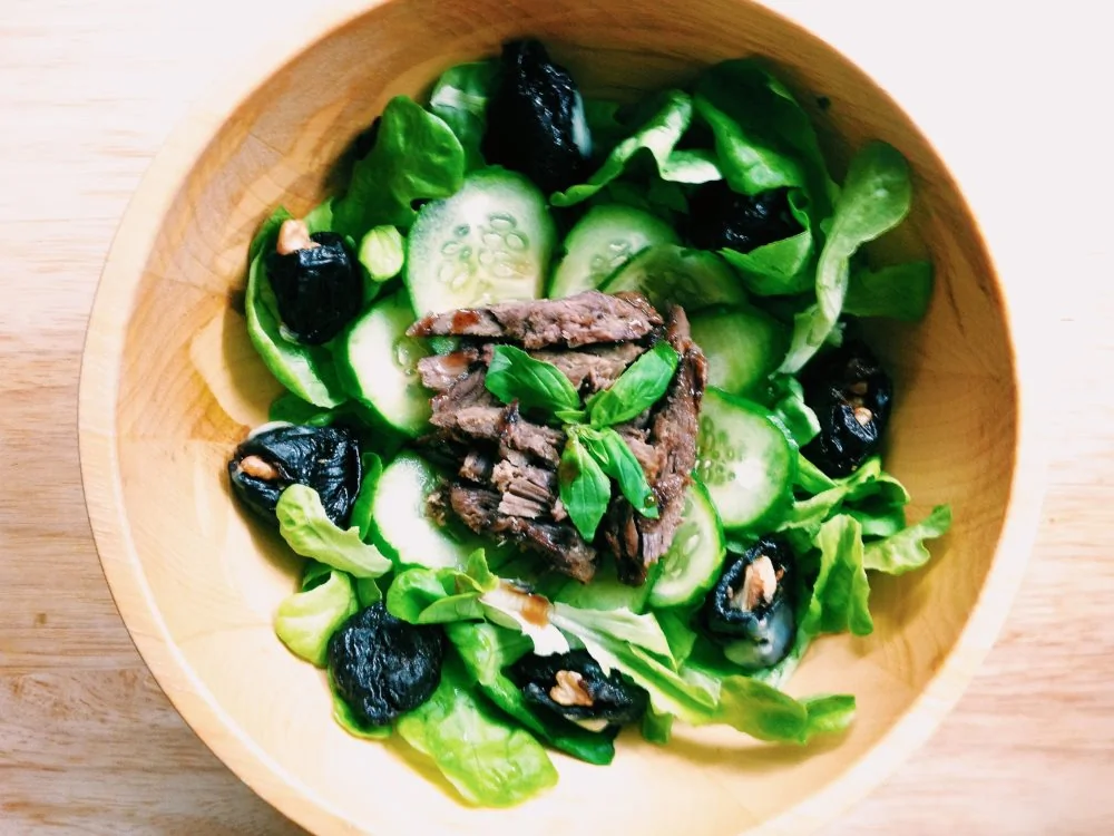 Салат с запеченной бараниной, черносливом и соусом наршараб