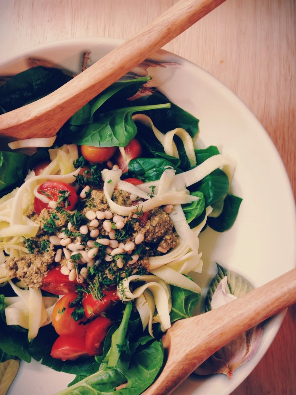 Салат из молодого кабачка с помидорами черри и мятным сицилийским песто