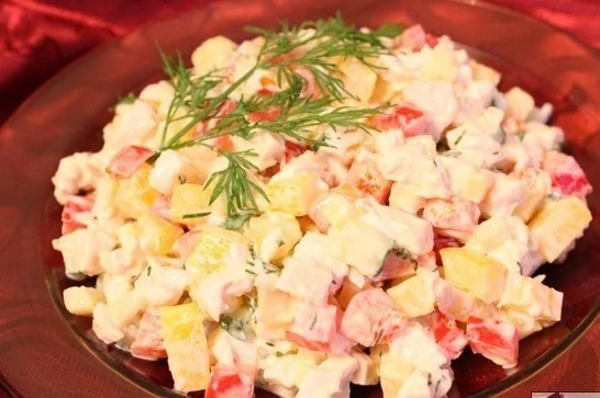ШАГ 7 Этот салат можно сделать и слоеный, слои укладывать по желанию, каждый слой немного смазывая сметаной.