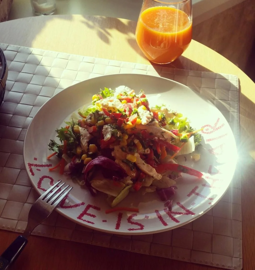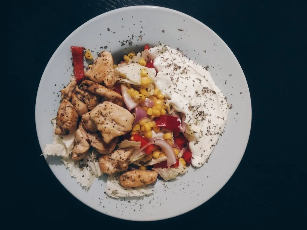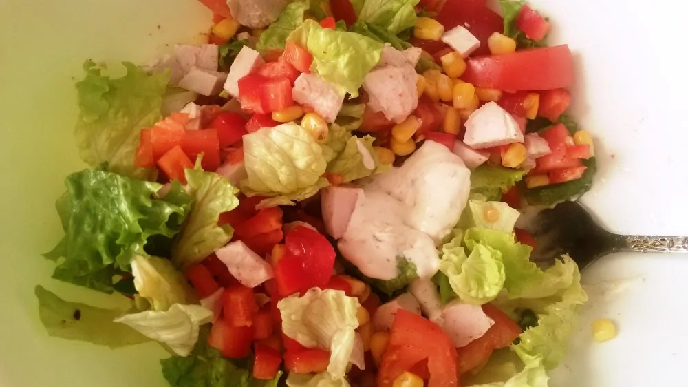 Легкий салат из овощей и куриной грудки с йогуртовой заправкой