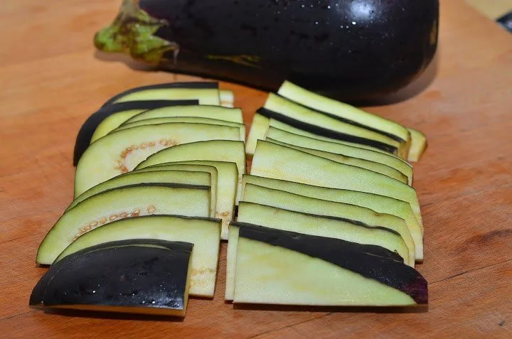 ШАГ 1 Помыть и нарезать баклажаны вдоль и поперек так, чтобы у каждого кусочка хоть с одной стороны была шкурка: так они не потеряют свою форму при жарке.