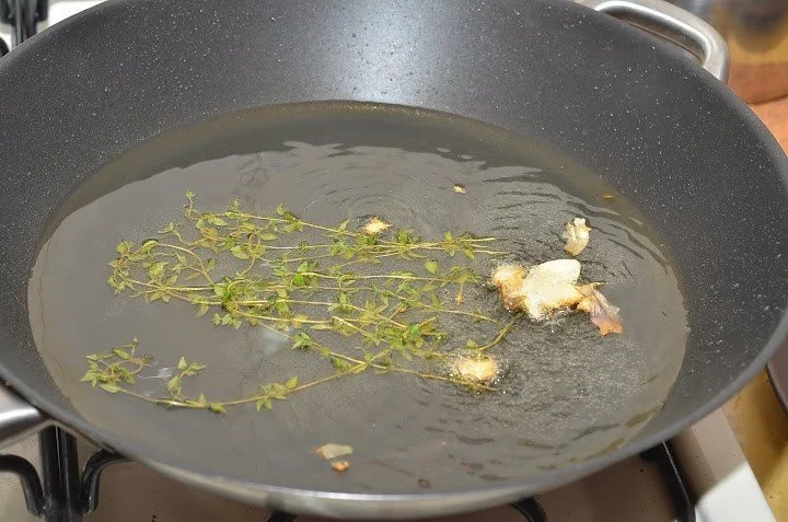 ШАГ 2 В сковороде с глубоким дном нагреть масло — примерно 2 см. Бросить туда тимьян и раздавленный чеснок (прямо со шкуркой). Жарить около тридцати секунд, затем выложить на тарелку.