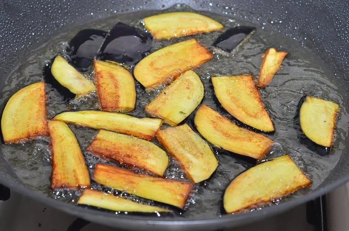 ШАГ 3 Погружать баклажаны в масло порциями. Обжаривать до готовности, до золотистого цвета. Выкладывать готовые баклажаны на бумажные полотенца, чтобы полотенце впитало лишнее масло.