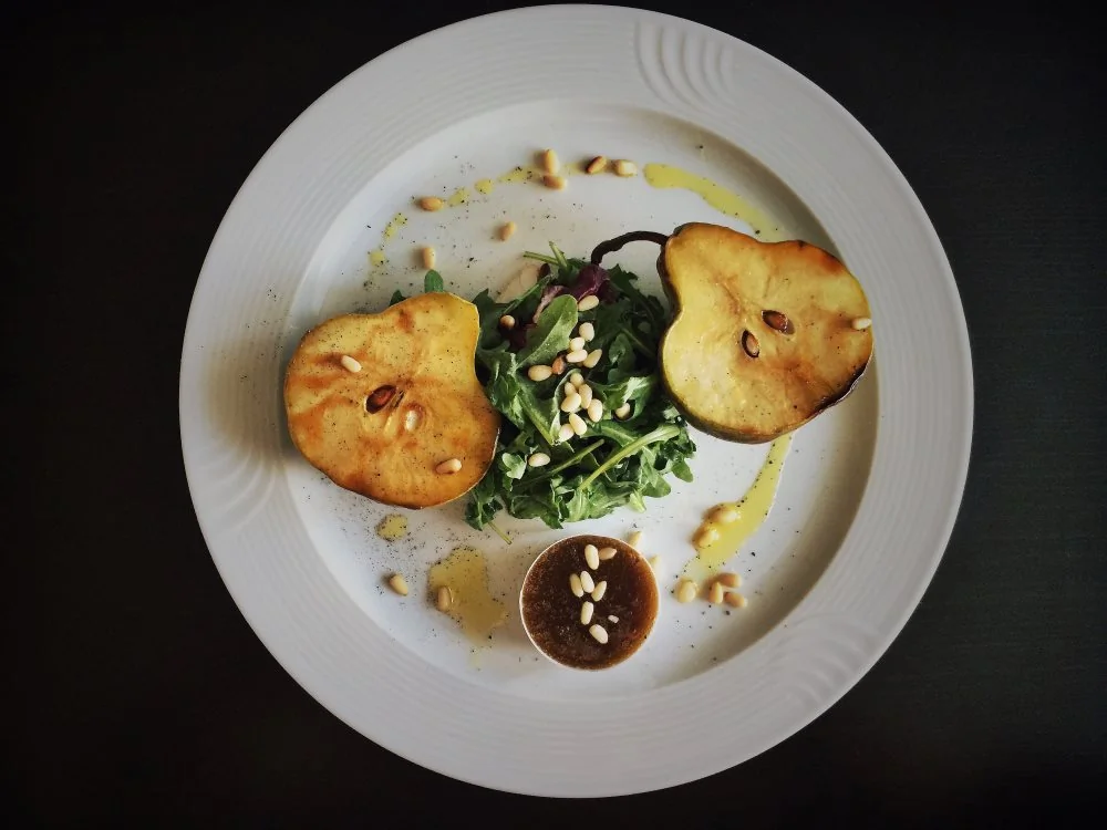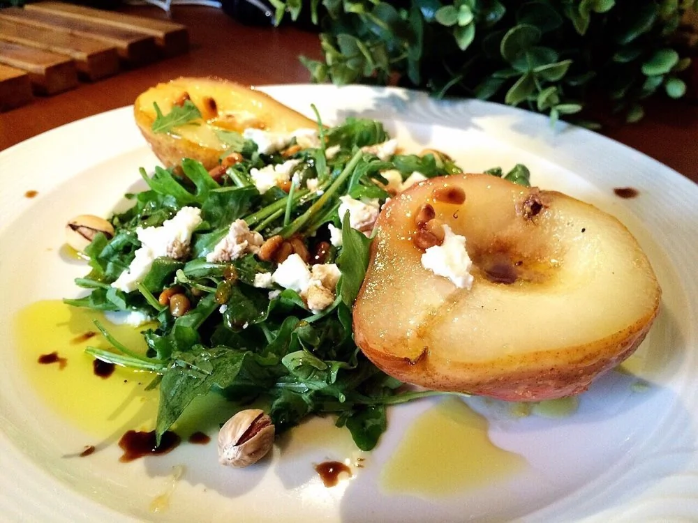 ШАГ 3 Грушу в янтарной карамели выкладываем к рукколе, а на сковороду (прямо в мед) отправляем кедровые орешки, буквально на минуту. Затем и их выкладываем на тарелку.
