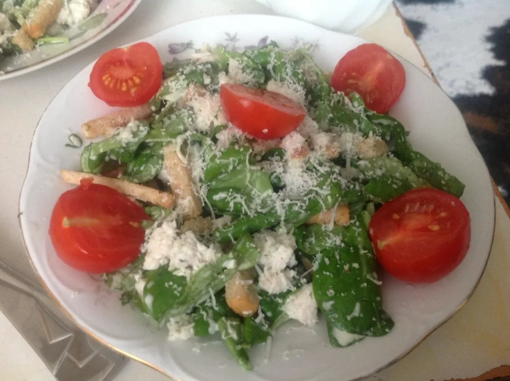 ШАГ 4 Смешать филе, салатные листья, помидоры и чеснок. Заправить салат соусом «Цезарь». Посыпать сыром и сухариками.