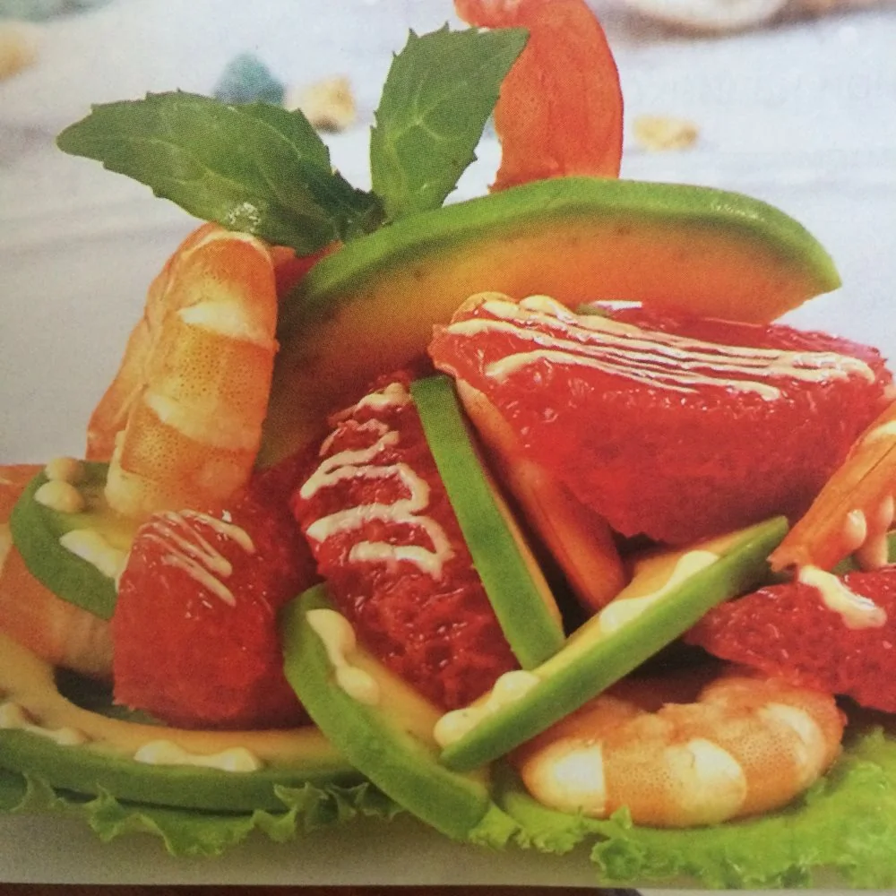 ШАГ 3 Выложить на тарелки креветки, авокадо и грейпфрут. Полить лимонным соком.