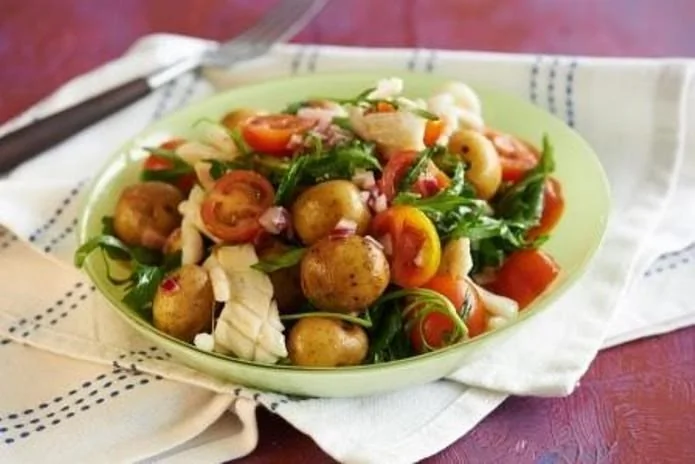 Салат из молодого картофеля и жареных кальмаров с помидорами черри