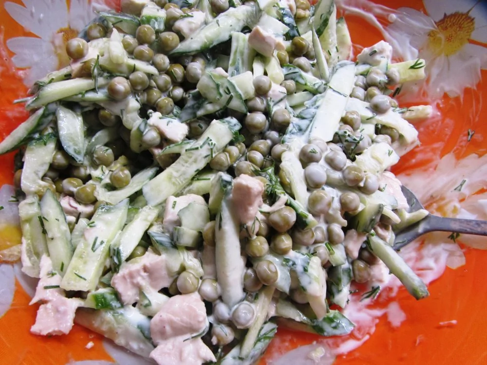 ШАГ 2 Свежие огурцы и остывшее куриное филе режем некрупными кубиками и отправляем в салатник. Затем добавляем к ним мелко нарубленный укроп и консервированный горошек.