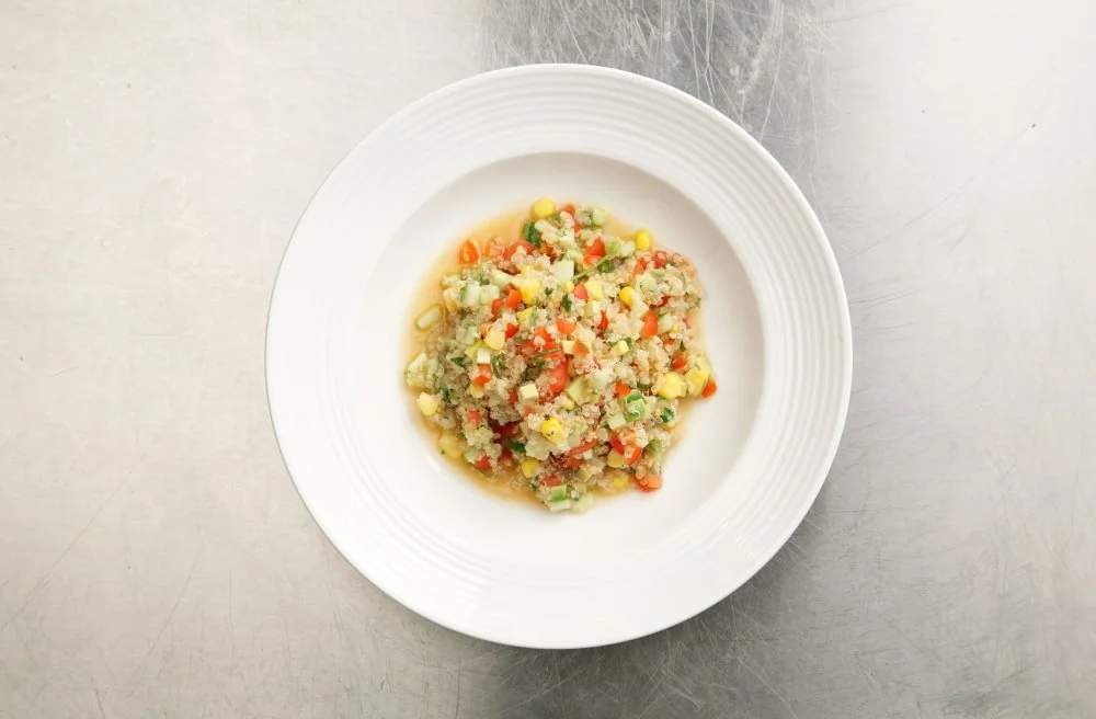 ШАГ 3 Все овощи нарезать кубиком 0,5х0,5 см и перемешать с киноа, добавить рубленую кинзу и петрушку. Заправить соком лайма, оливковым маслом и солью.